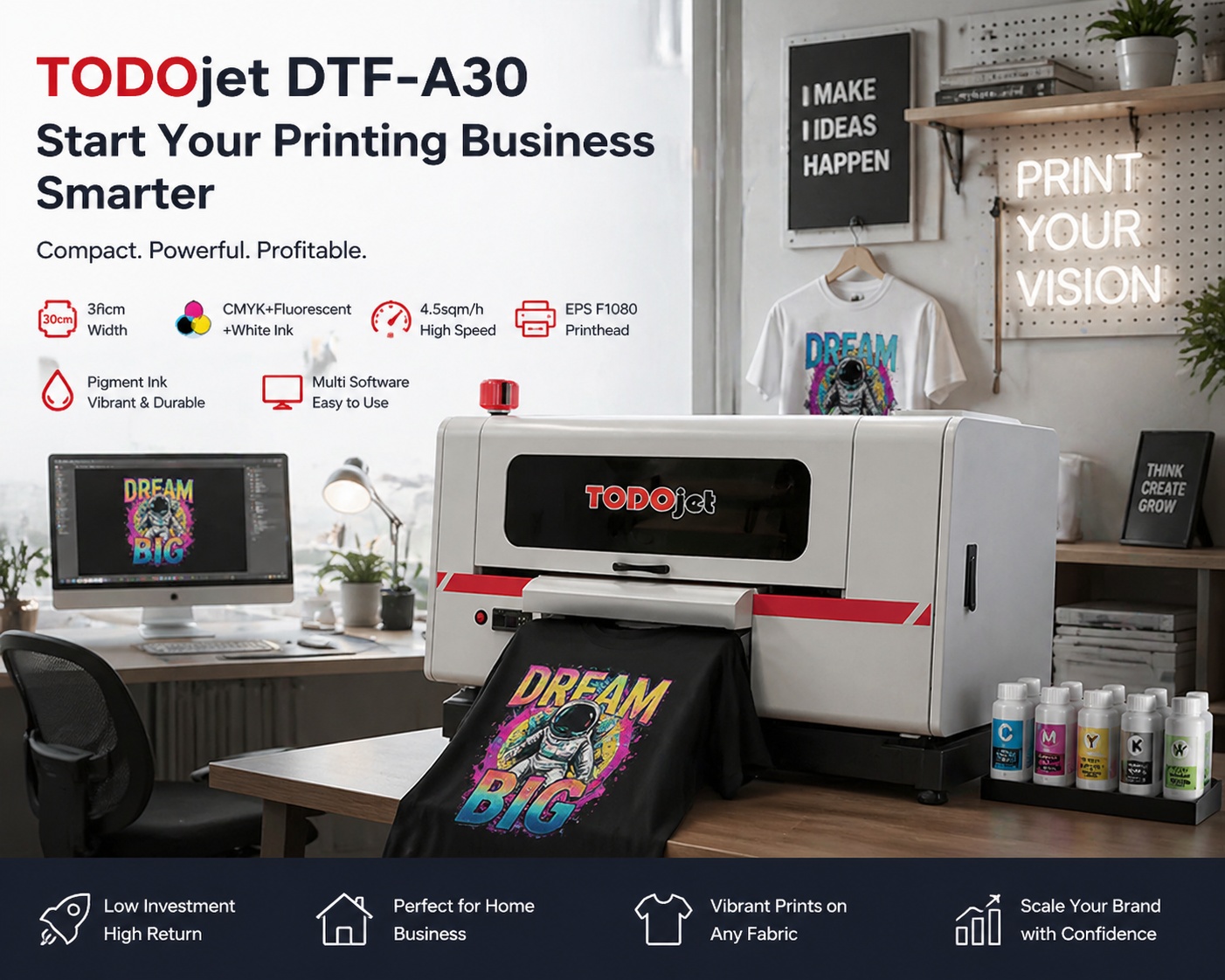 At TODOjet, we understand the unique challenges small businesses face—tight spaces, limited budgets, and the need for reliable, high-quality printing. That’s why we developed the DTF-A30 Printer, an innovative and compact solution built specifically for entrepreneurs who want to scale their business without sacrificing print quality or performance. Let’s dive into why the DTF-A30 is the best choice for small businesses and how it can help you print smarter, faster, and more efficiently.